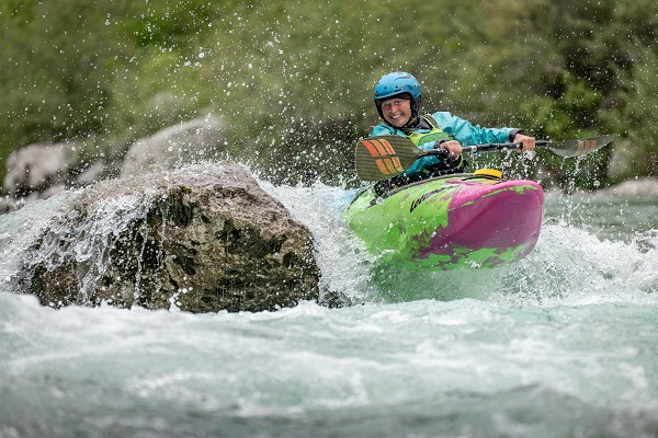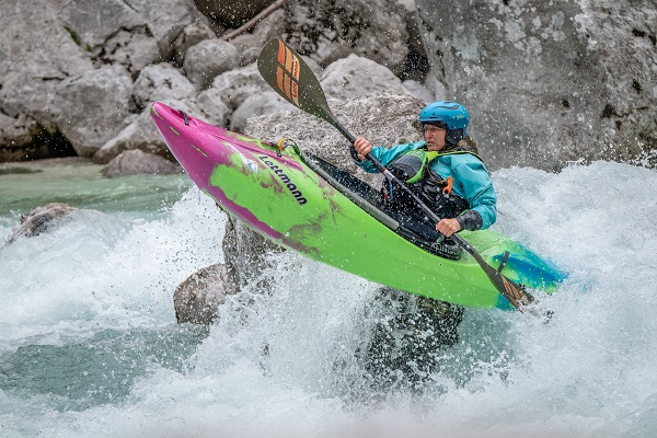 Auch wer keine Machete hat oder kennt, der sollte unbedingt mal unseren THP probieren. Denn das Kajak ist nicht nur super leicht zu fahren, sondern macht auch riesig Spaß. Durch das breite und flache Unterschiff mit der ausgeprägten Kante ist der THP anfangsstabil, drehfreudig und trotzdem spurtreu. Er ist verspielt wie kein zweiter Creeker und lässt sich selbst in kleinen Wellen und Walzen spinnen und kontrolliert surfen. Er booft sich super leicht, die Kante am Heck lässt sich mit wenig Kraftaufwand versenken. Je mehr man auf die Kante geht, desto leichter lässt sich die Spitze heben und man fliegt förmlich über Walzen und Rückläufe. Der THP skippt kontrolliert aus Stufen und Fällen und lässt auch bei voller Fahrt noch eine Kursänderung zu.