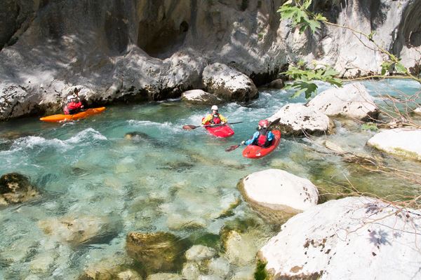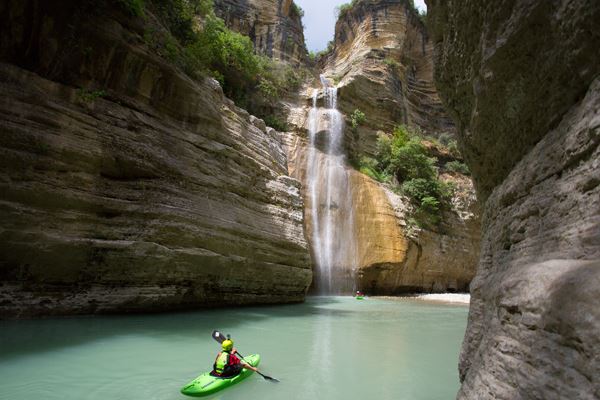 Der Osum ist der Vorzeige-Fluss Albaniens. Eine tiefe Schlucht frisst sich in das Sandgestein. Es ist traumhaft schön und nicht schwer. Maximal Wildwasser drei wartet auf uns.